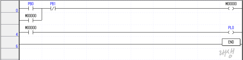 입력 신호인 PB0을 누르면 출력램프 P20이 점등된다. 출력신호가 계속해서 신호를 주기 때문에 PB0 버튼에서 손을 떼더라도 회로는 유지딘다. 정지 스위치인 PB1을 누르면 초기상태로 돌아간다.